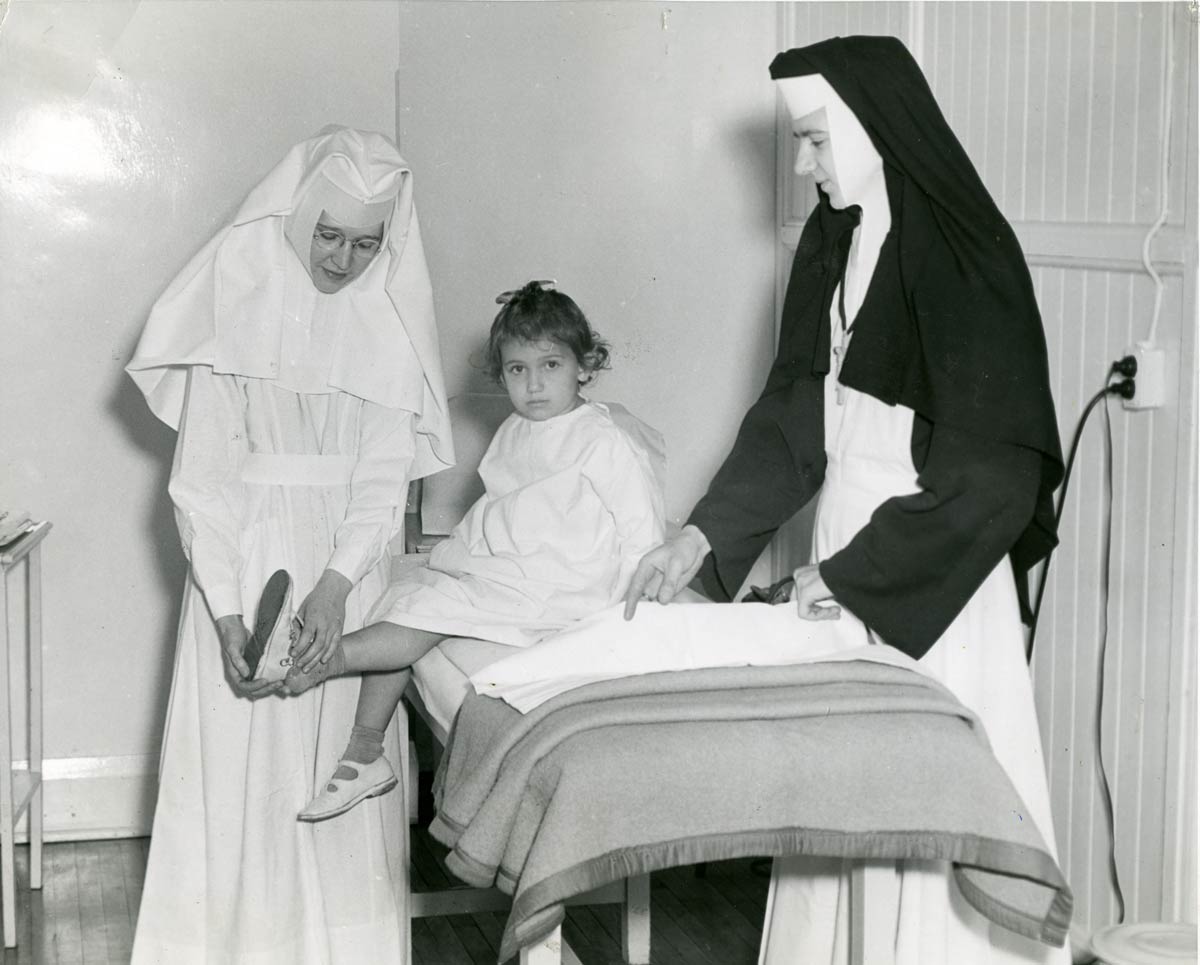 Sister Mary Dolores and Sister Mary Bertrand with a young patient at St. Gerard Clinic in 1954, the same year the clinic closed. Beginning in 1938, Felician Sisters were on call at the clinic as part of their contract with the Catholic Resettlement House.
