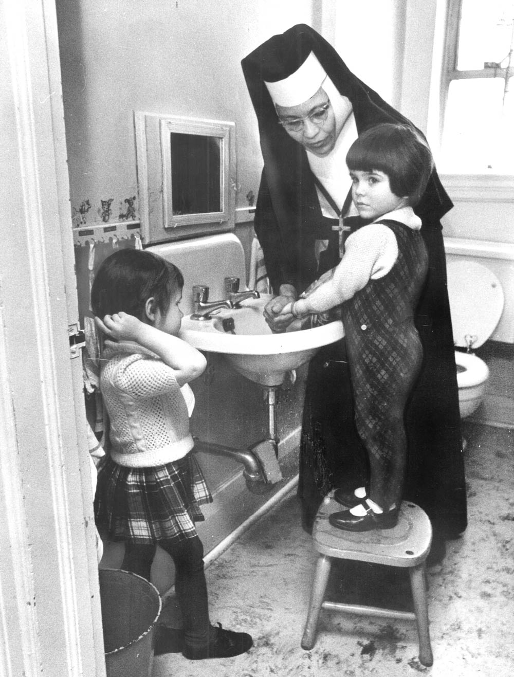 Sister Mary Agnes helps three-year-olds wash up at the Catholic Resettlement House Day Nursery in 1966.
