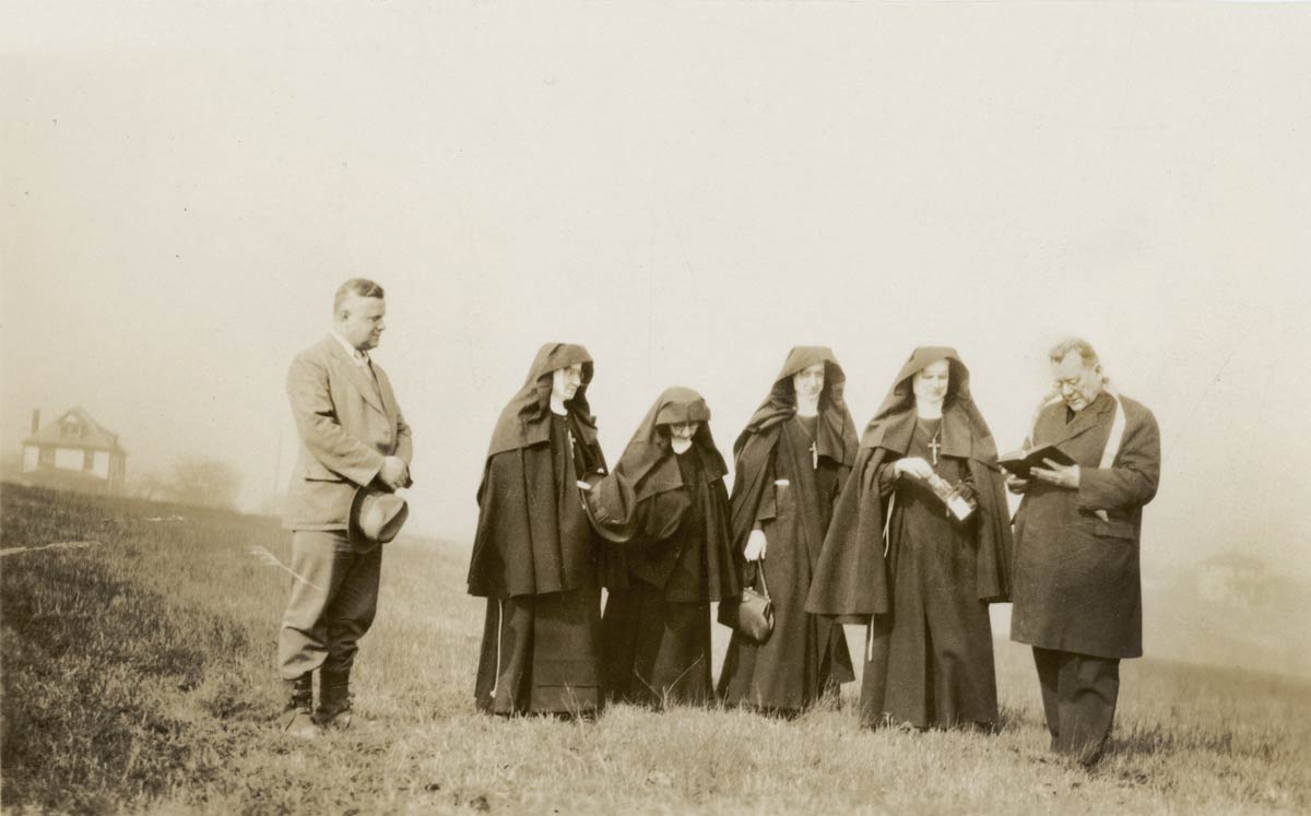 Photographed in 1930, are Provincial Superior MM Leona Chojnacka (second sister from the left), with her council, as well as Monsignor John S. Gorzynski (center) and Anthony Pyzdrowski, the combined architect, contractor, and construction engineer of the new Our Lady of the Sacred Heart Motherhouse, as the digging began for the build.