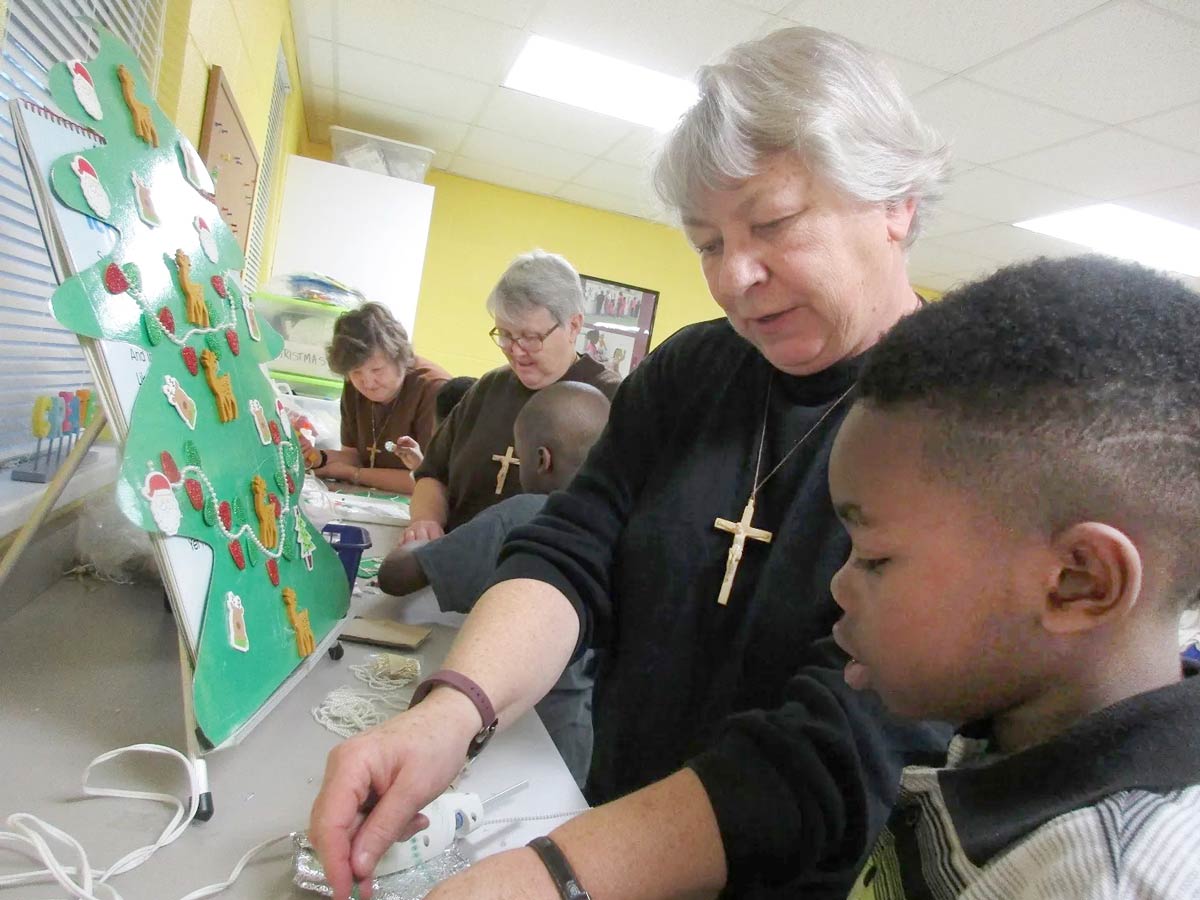 Pictured are Sister Mary Susanne Dziedzic (right) working on a Christmas craft project with neighborhood children in the Learning Center, a part of the Felician Center in Kingstree, South Carolina. Sister Mary Carol Piskor and Sister Mary Johnna Ciezobka, partners in the ministry, work with other students.