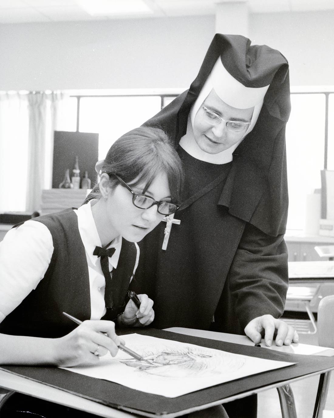 In this photo, Sister Mary Colette Michniewicz is teaching art class at Holy Name of Mary Catholic School.