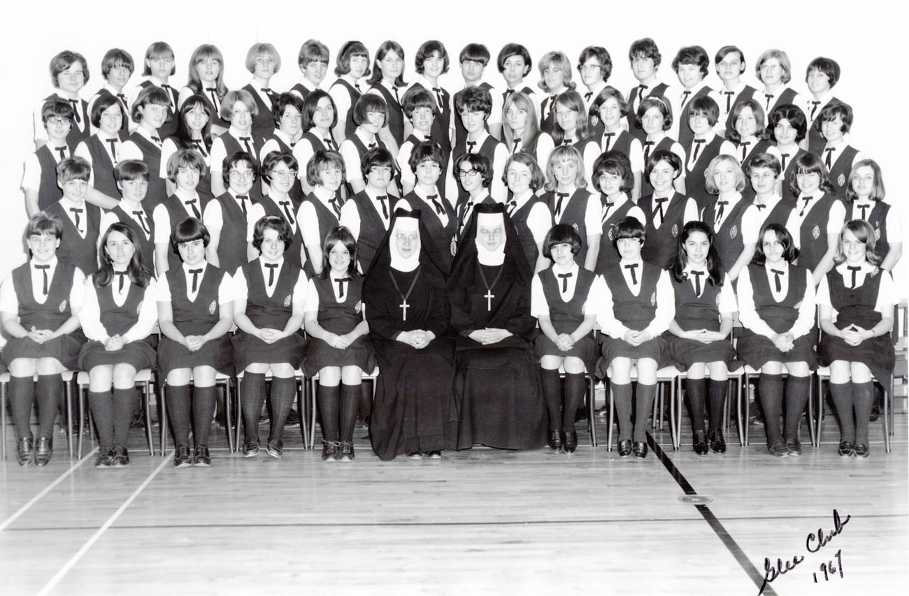 Sister Mary Rachel Krauza and Sister Mary Felicia Bealier are seated with the Holy Name of Mary High School Glee Club in 1967.