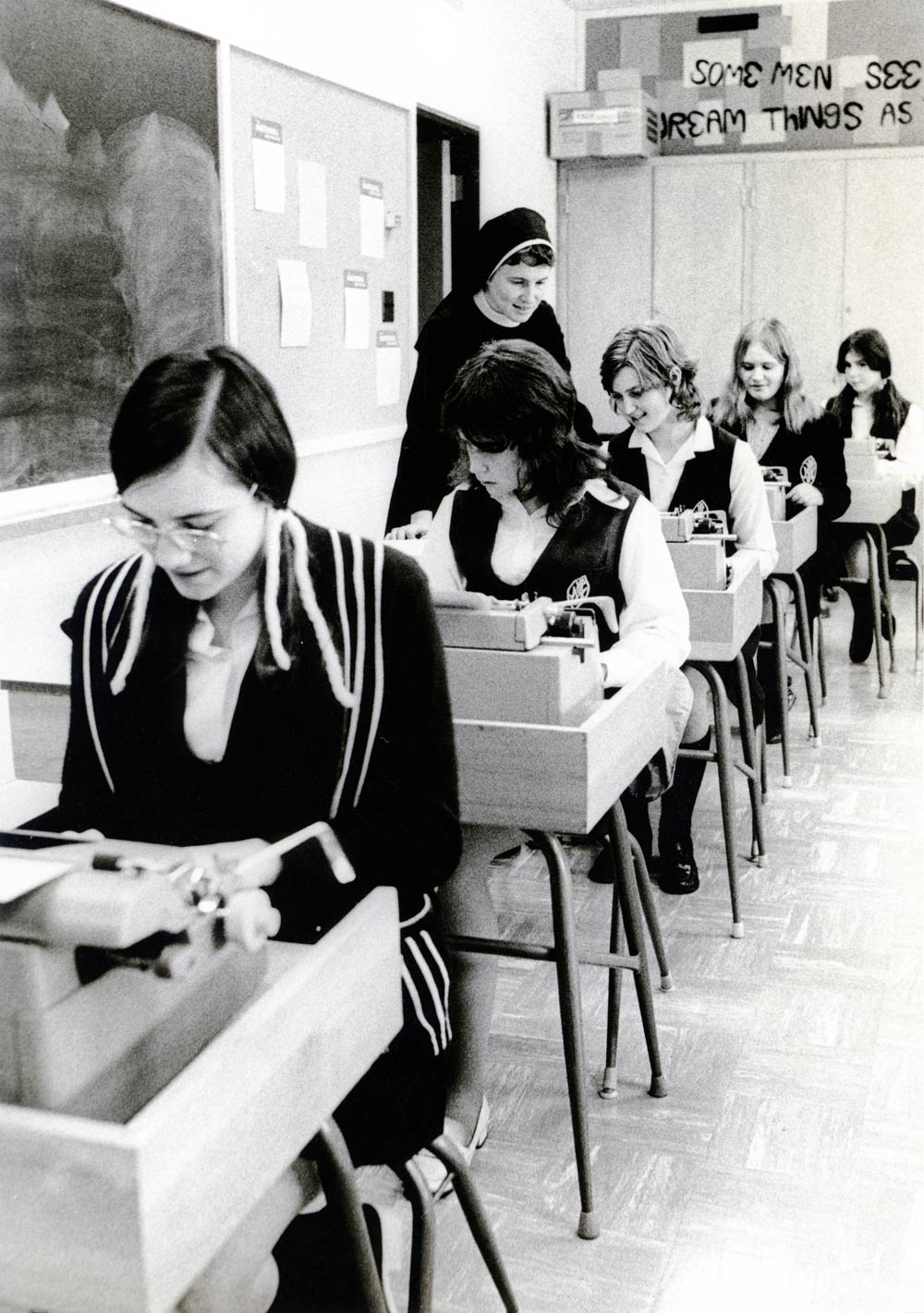 In this photo, Sister Mary Joanne Baradziej is teaching typewriter skills to young women from Holy Name of Mary Catholic School in the early 1970s.