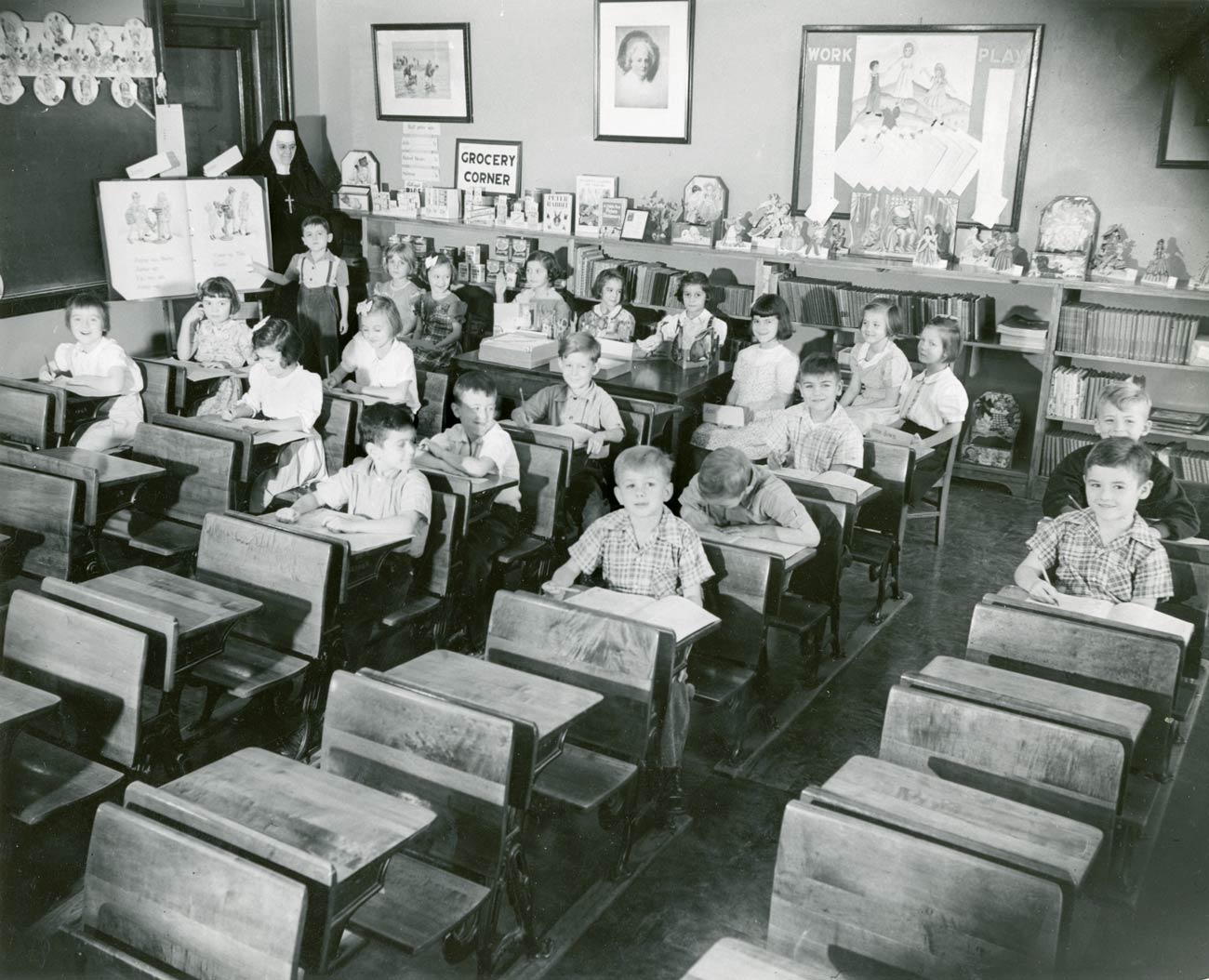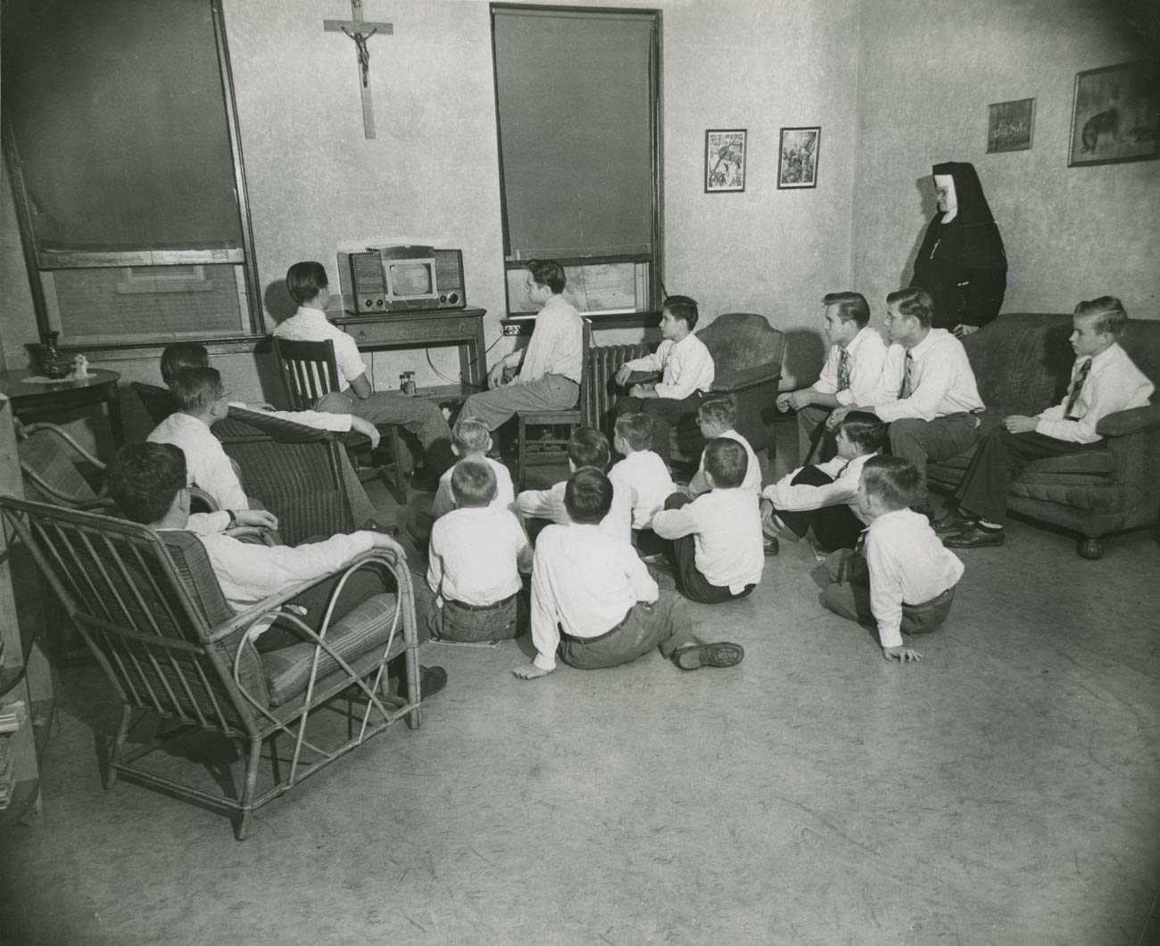 This 1949 photo is of Sister Mary Margaret and the boys gathered around the radio in the boys’ living area of the Immaculate Conception Home.
