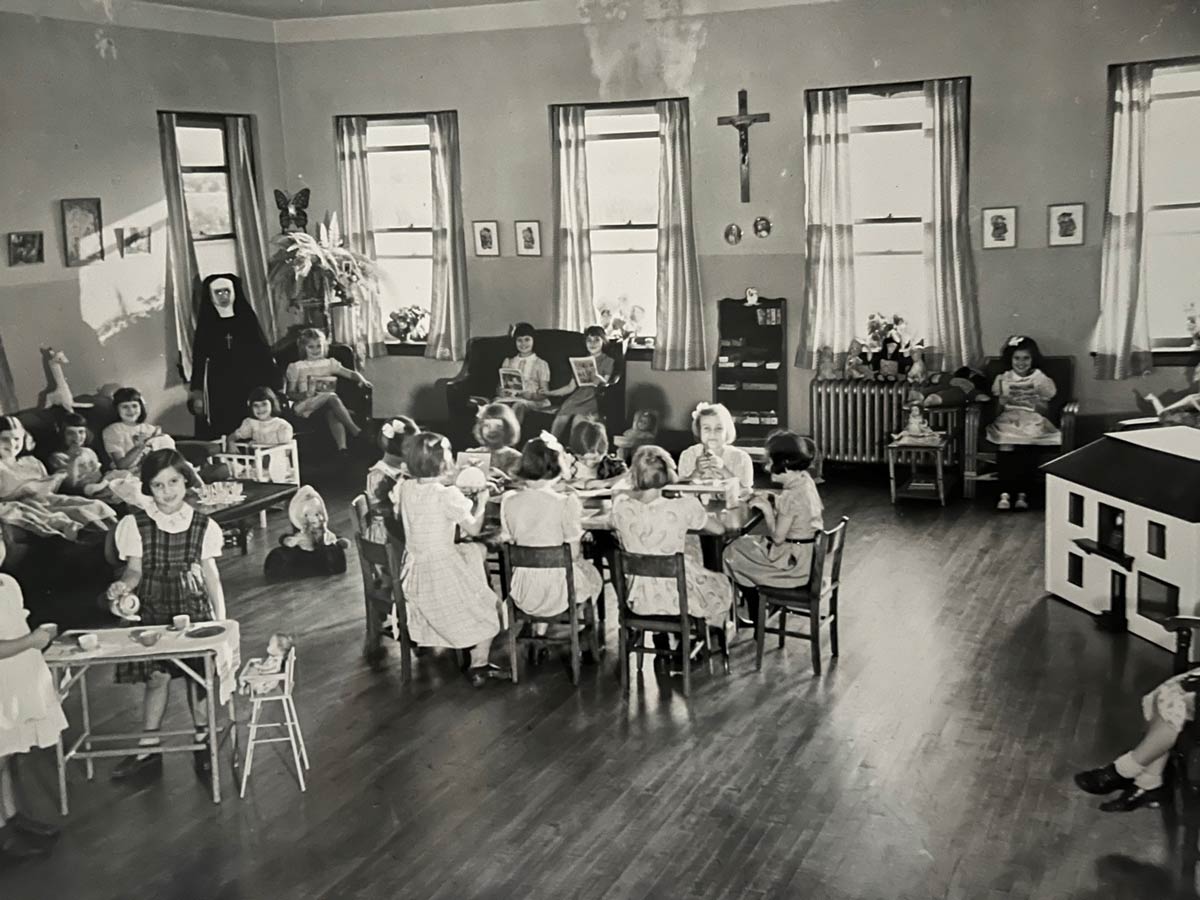 The five-story Immaculate Conception Home was built in 1926 to accommodate 190 children. The home for orphans was first housed within the sisters' convent, then in the little red house on the convent grounds, until this standalone facility was built adjacent to the motherhouse.