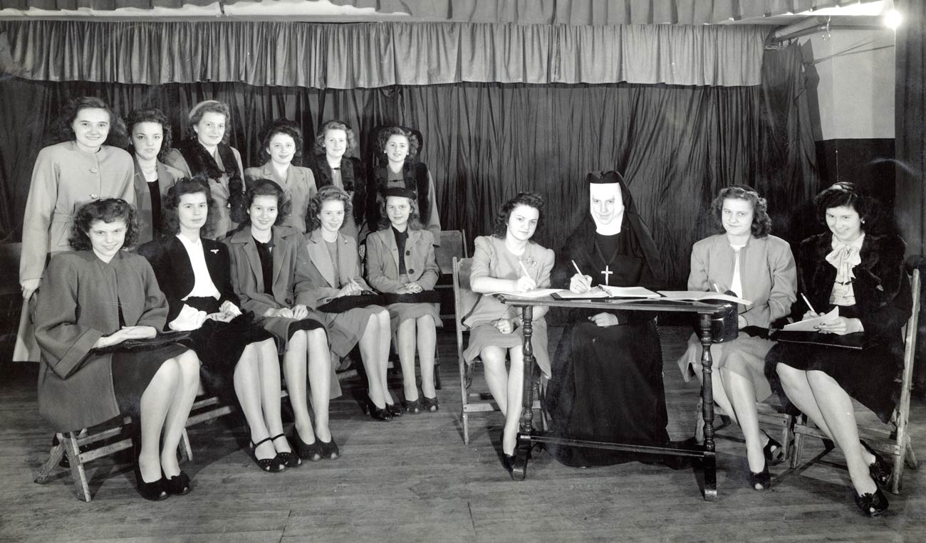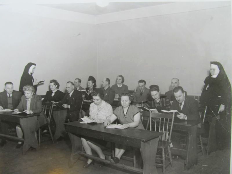 Mother Mary Sylvina Perska (far right) and another Felician Sister teach English language to Polish immigrants, many displaced or refugees of WWII. The sisters conducted classes in the parish hall and performed social work among the parishioners.