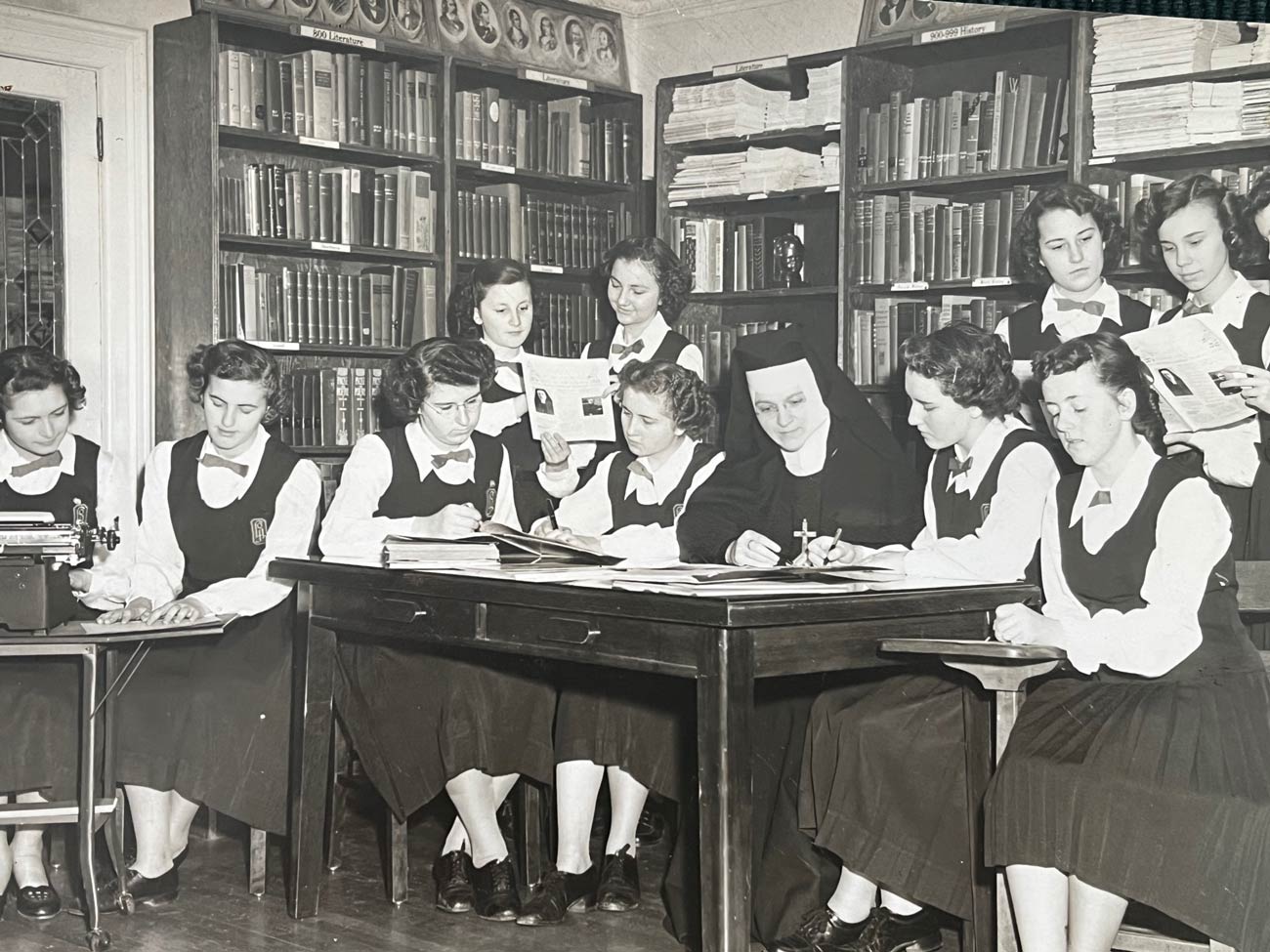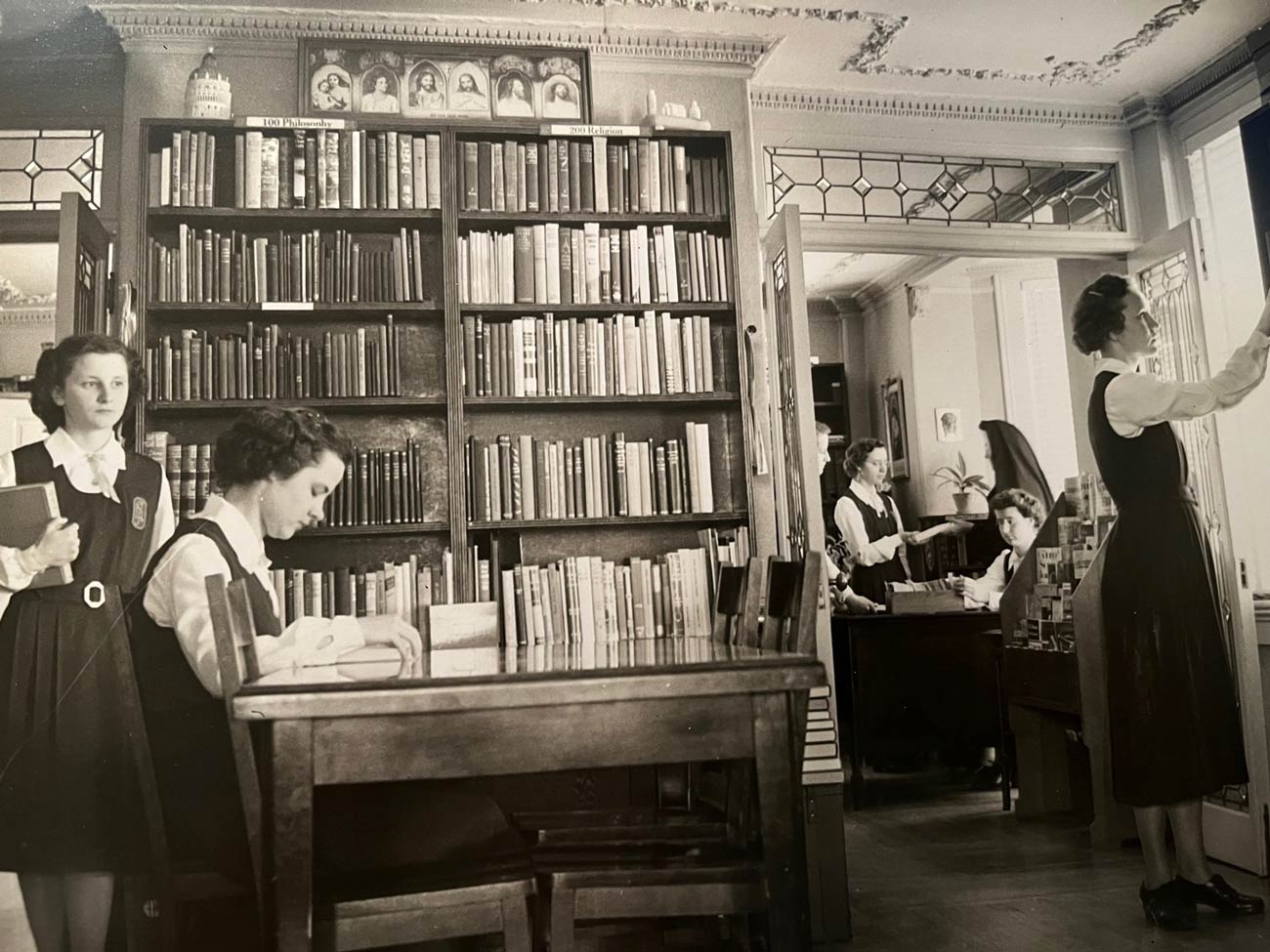 Students are assisted by Sister Mary Pontia, the librarian at Our Lady of Angels Academy.