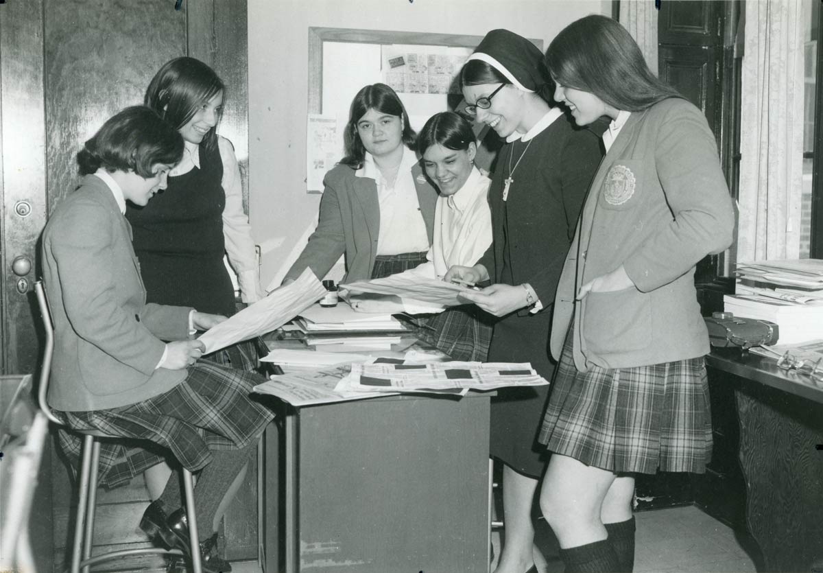 Sister Constance Marie Tomyl working with girls on the Our lady of the Angels Academy newspaper.
