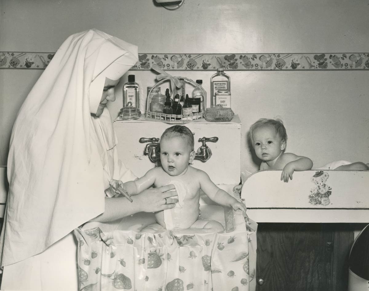 Sister Mary Joan bathes babies in the Our Lady of Victory nursery, a maternity home and adoption service in Oklahoma.