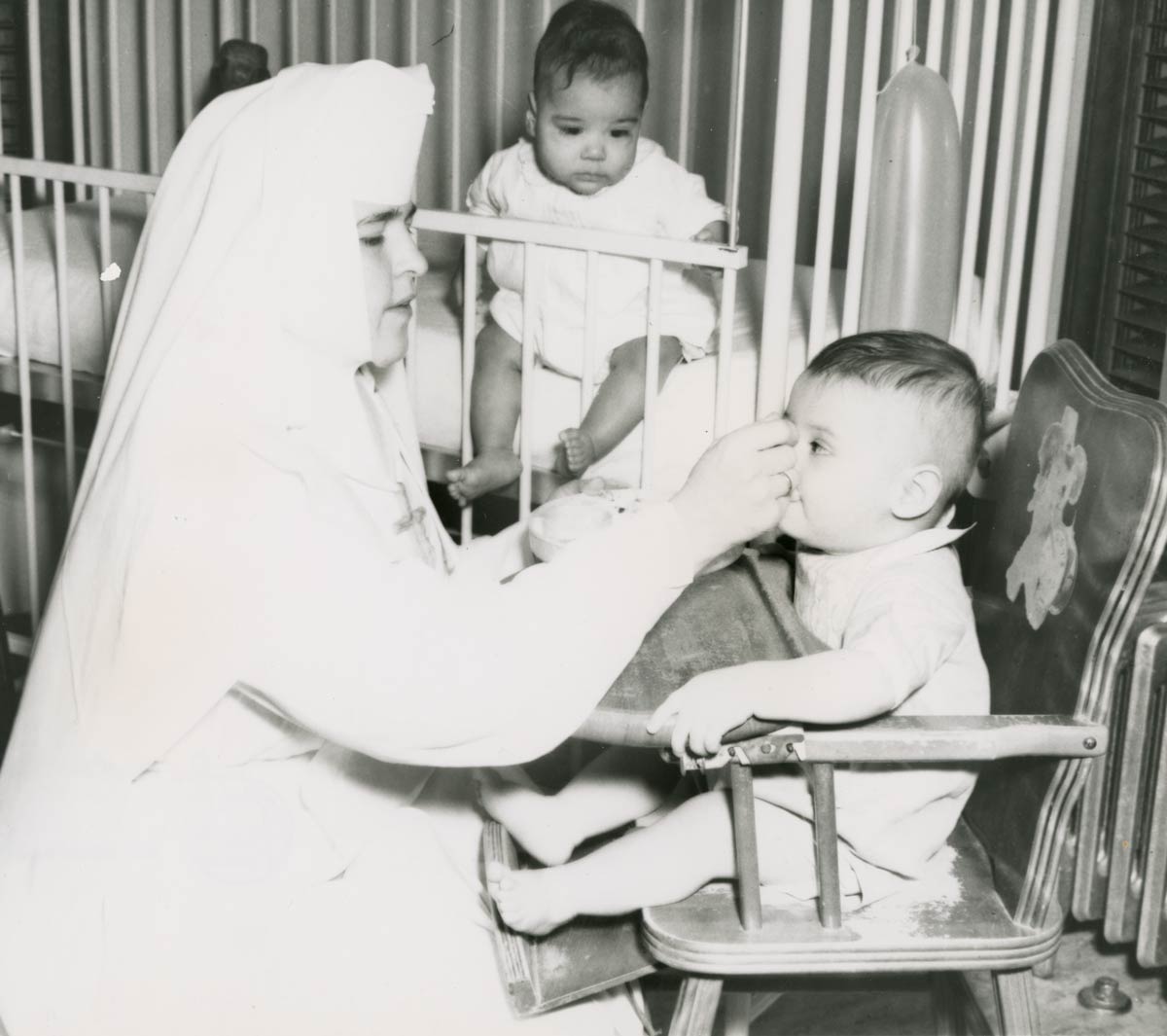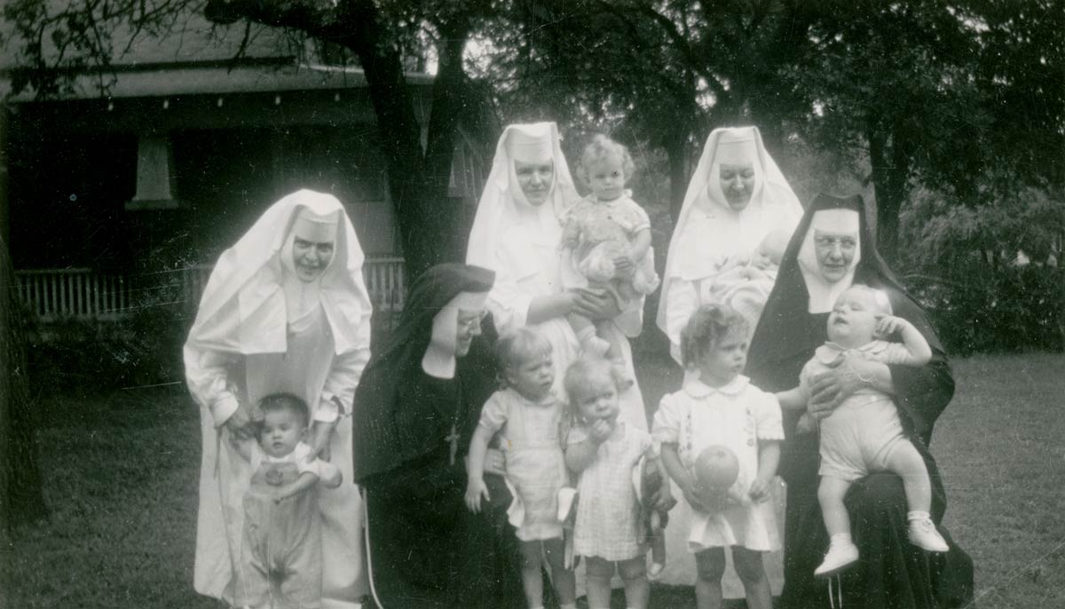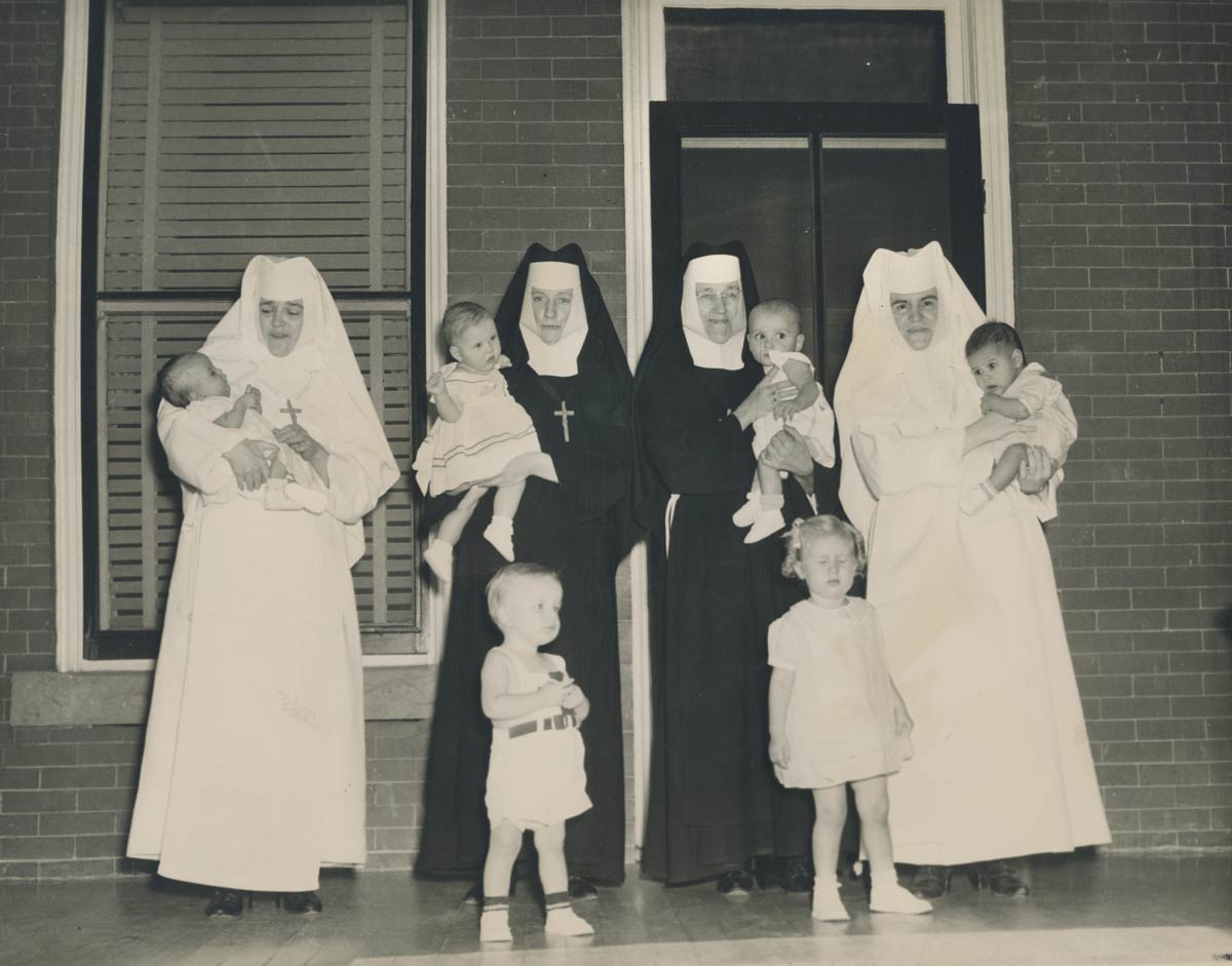 Caring for children awaiting adoption at Our Lady of Victory were Sister Mary Joan, Sister Mary Maurice, Sister Mary Amadea, Sister Mary Regis, and Sister Mary Amabilis.