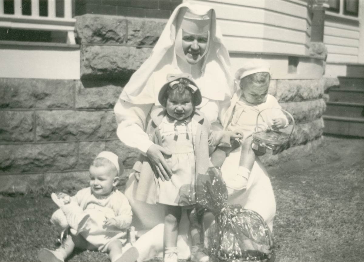 Sister Mary Maurice poses with babies dressed for Easter at Our Lady of Victory, at its first location in Oklahoma City, OK.