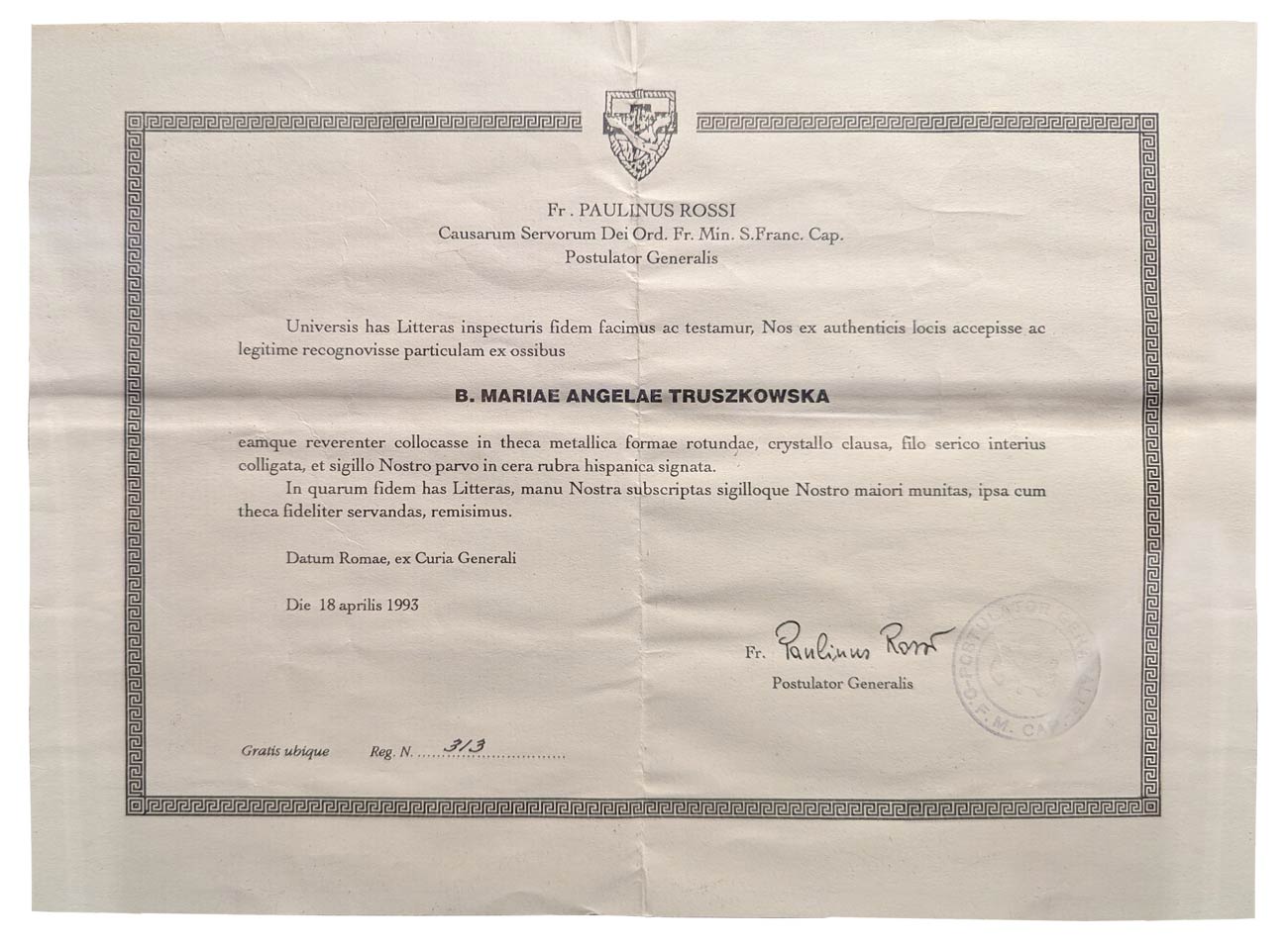 A relic of Blessed Mary Angela Truszkowska is contained within this reliquary, accompanied by an authenticating document.
