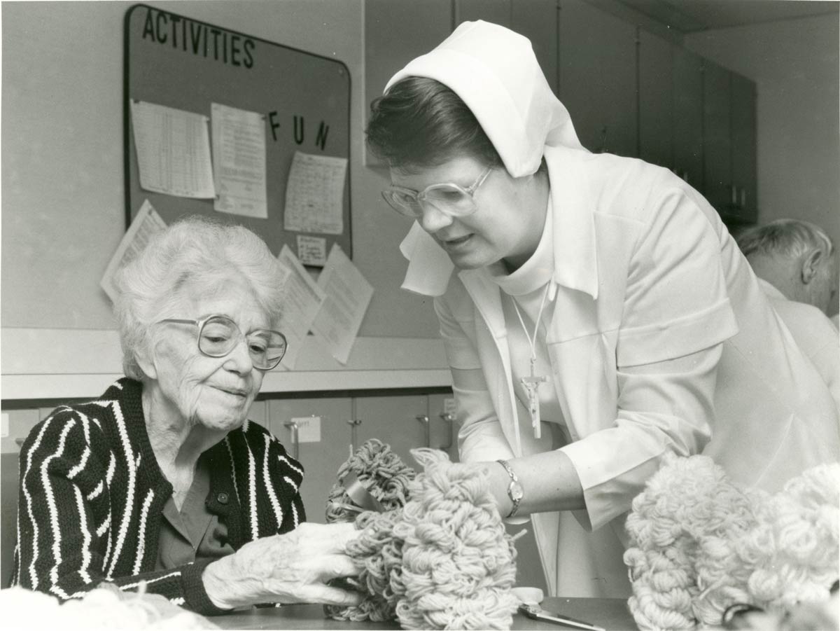 Sister Mary Denise Bernas works on a craft activity with a resident of St. Ann Home in Greensburg, PA.