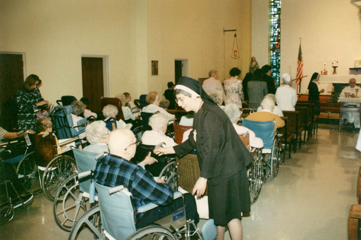 S Bernice Marie Feidor, named administrator of St. Ann Home in 1993, assists residents arriving for Mass in the home’s chapel.