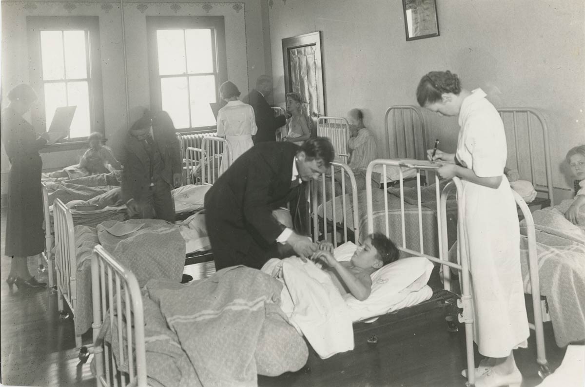 The infirmary at St. Joseph Home in Milwaukee, Wisconsin, in 1935. A 50-bed infirmary was added when the home opened, as many of the first orphans had physical handicaps.