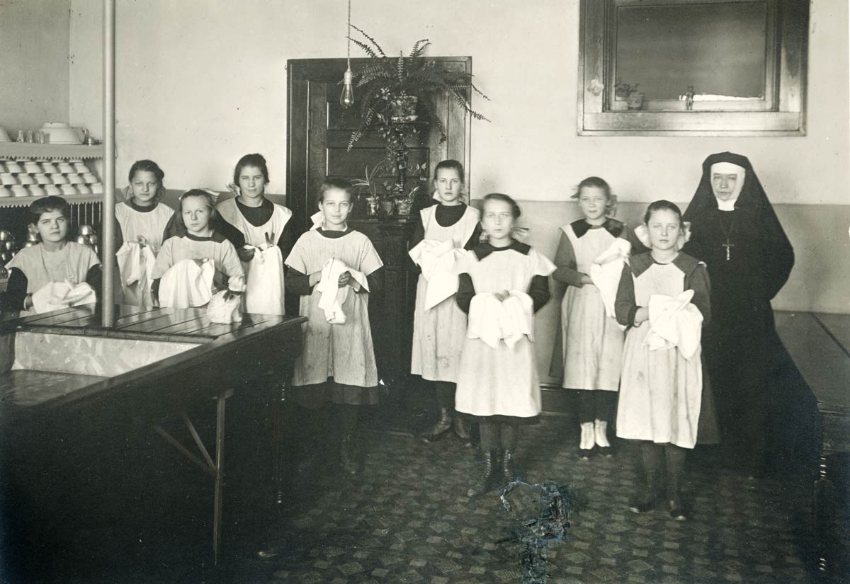 Girls working in the kitchen at St. Joseph Home in Milwaukee in 1924.