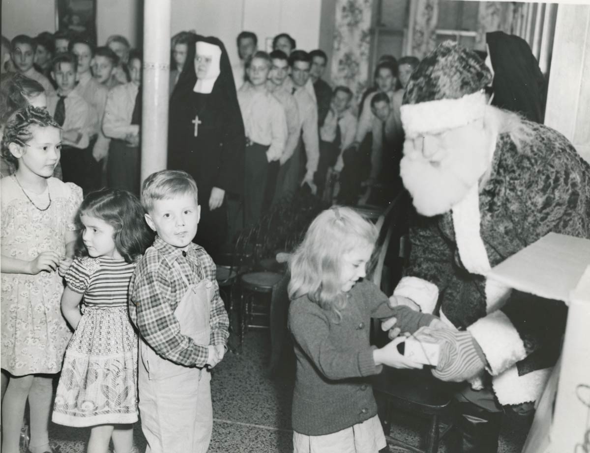 Children from St. Joseph Home in Milwaukee lined up to meet Santa Claus under the watch of SM Theresa in the 1950s.