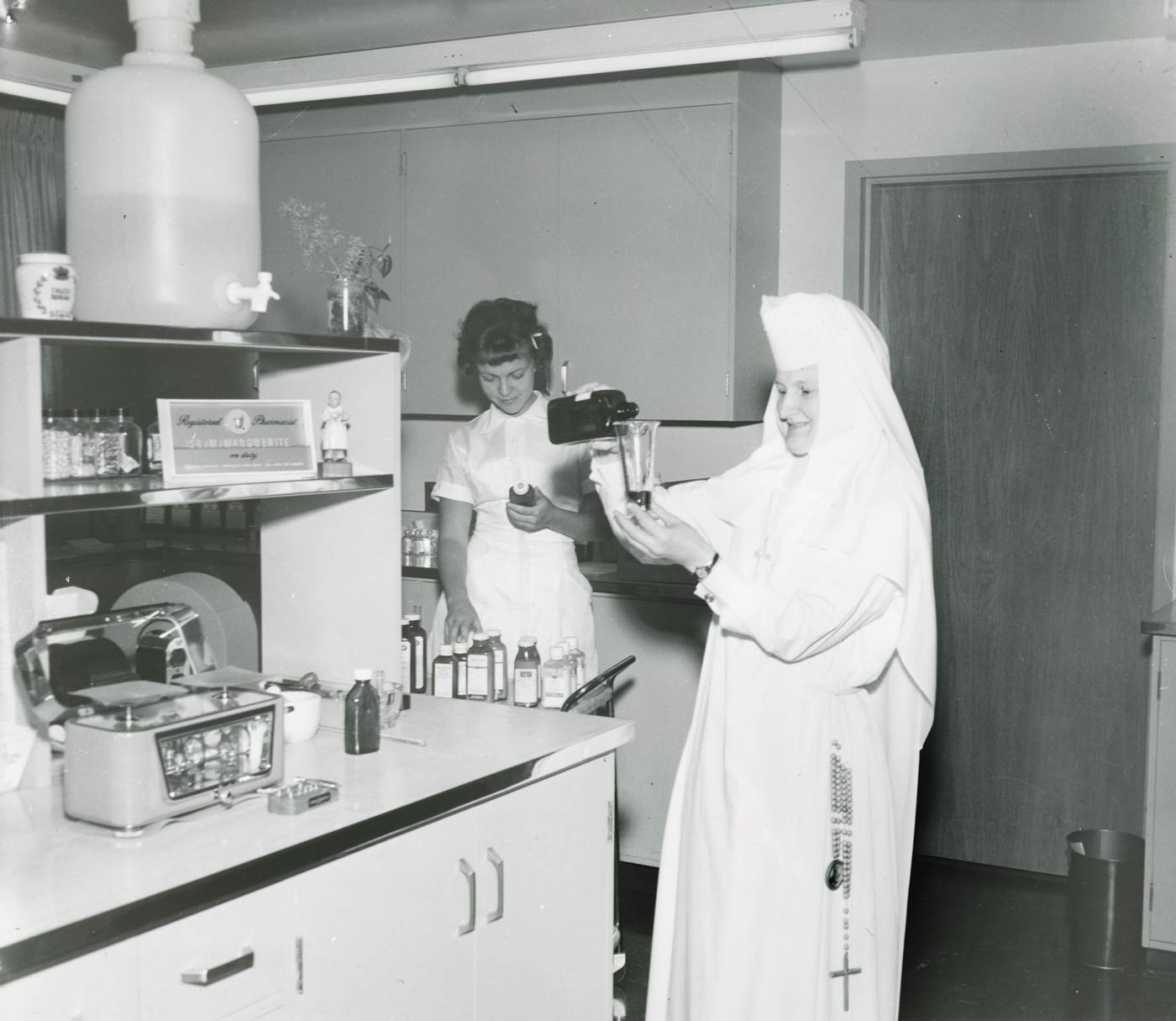 Sister Mary Marguerite measures out medication at St. Mary Hospital in Livonia, Michigan.