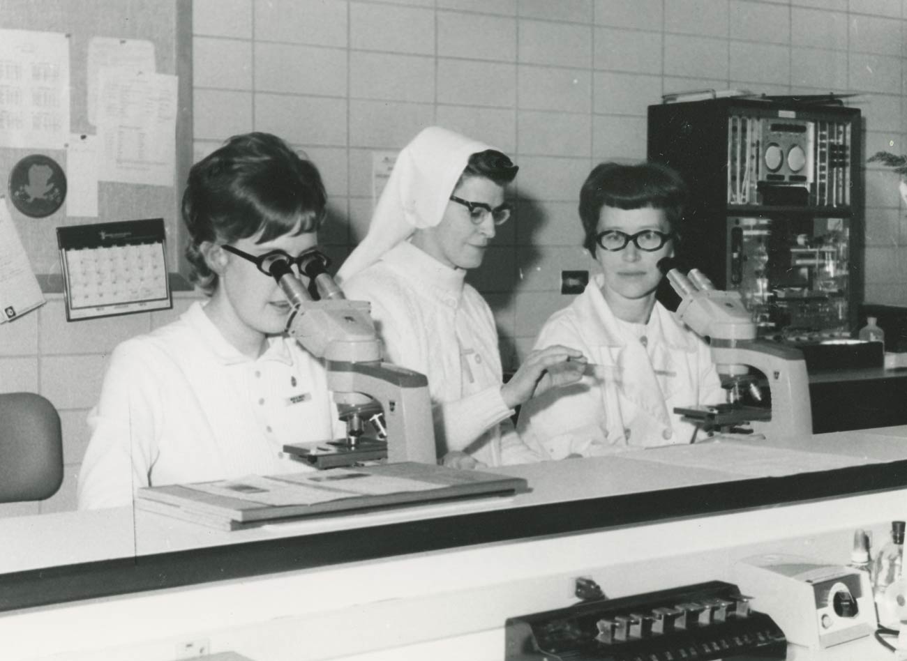 Sister Mary Modesta Piowar (center), lab supervisor and eventually vice-president of St. Mary Mercy Hospital in Livonia.