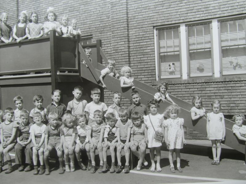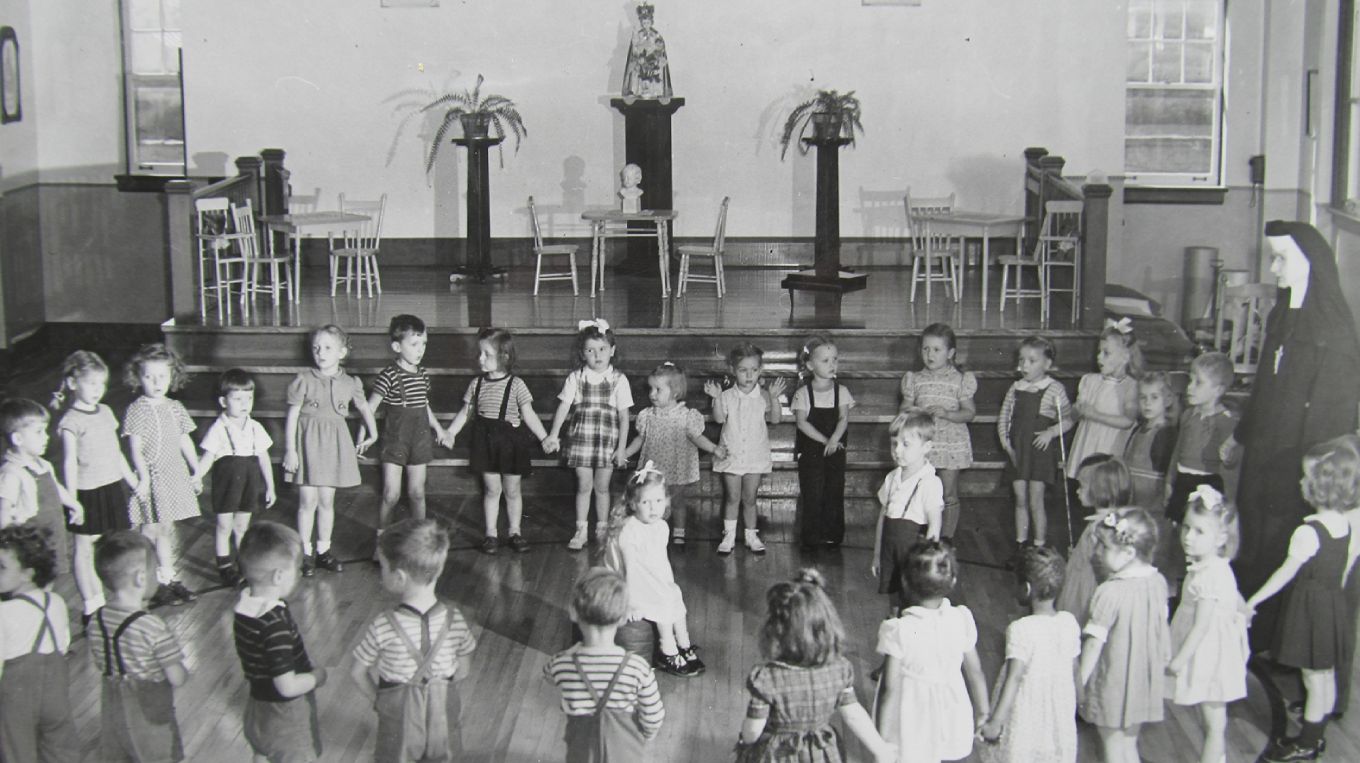 This photo is of children attending St. Stanislaus Nursery in the late 1930s, when it was located within the Felician convent on Augusta Avenue. The nursery was set up in what had been the ballroom of the former Leadlay Mansion. In 1940, a former garage space on the property was used to erect a facility to house the nursery.