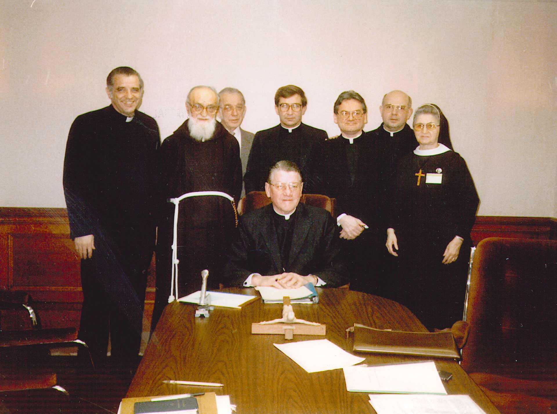 The Diocesan Tribunal for the Investigative Process of the miracle, photographed on February 10, 1986. Standing: Msgr. Angelo Caligiuri, Padre Bernardino Romagnoli, Dr.Casimir Pietraszek, Msgr. Peter Popadick, Rev. David Slubecky, Rev. Robert Golombek, and Sister Mary Antonelle Dziechciarz, vice-postulator (not a member of the Tribunal). Seated was Most Rev. Edward D. Head, Bishop of Buffalo.